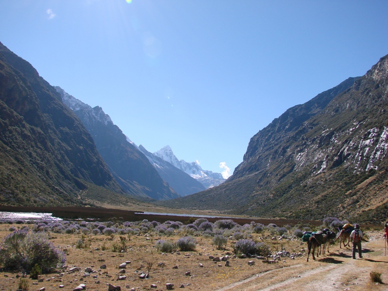 Recojo del hotel en Huaraz y traslado en bus privado desde Huaraz hacia Cashapampa (2900m) que nos tomara 3 horas, donde nos espera en arriero y burros para trasladar el equipo técnico de ascensión como de campamento después inicio del trekking por la quebrada Santa Cruz hasta el campamento de Llamacorral En donde realizaremos nuestros Campamento