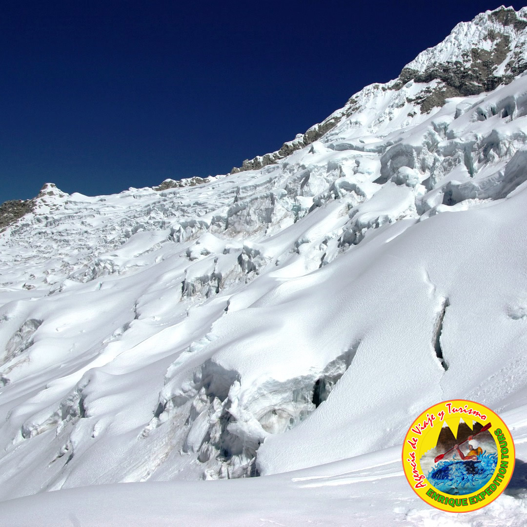 Este día desde el Campo 1 descenderemos con nuestros clientes hasta la base de la pared, posteriormente ascendemos hasta alcanzar la parte mas baja de la rimaya, en esta parte se avanza por una zona en gran pendiente uniforme de unos 55º - 60º y lleguemos a una parte mas pendiente de 85º y de 90º en una altura de 4 metros, continuando por la canaleta original (65º - 75º) encontremos algunos pequeños tramos mixtos hasta llegar a la Cumbre cimera – Col.