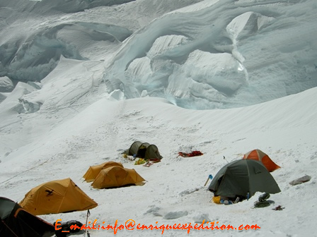 Desde el campo superior en la morrena estaremos alcanzando el borde del glacial, desde donde avanzaremos en ascenso por un lugar mas seguro, en dirección hacia la base de una gran barrera de Seracs. En donde nosotros instalaremos el C1 en el Glacial - jornada de aprox. 6 horas.