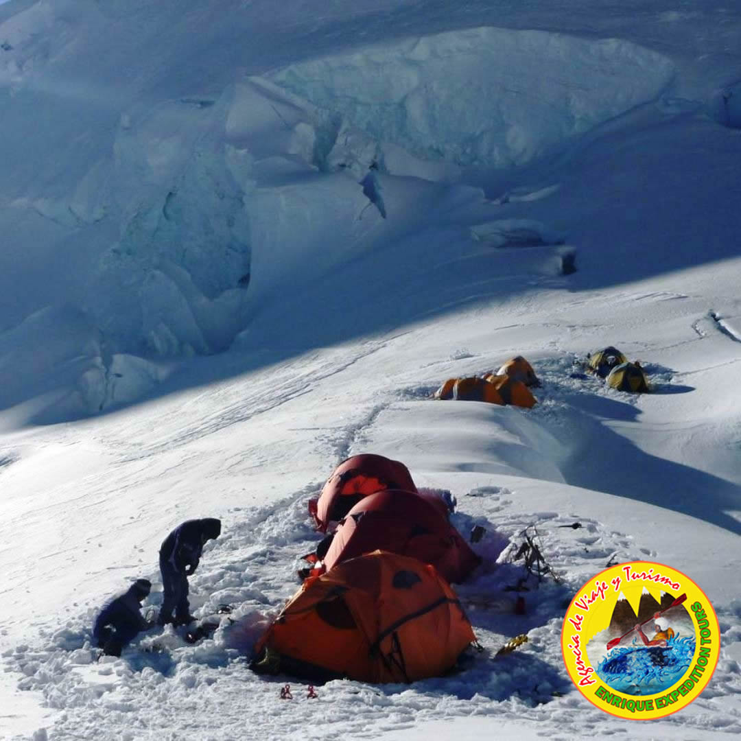 This day we will continue climbing up directly towards the shield, which is observed - as we move forward - like a triangular hill of about 450m. Once we will be at this place we will pass it. After passing this obstacle, we will ice climb some sections. We will reach by cross climbing the neck, under which in a protected area of avalanches we will build up the Camp 2 of Huascaran (6000m).