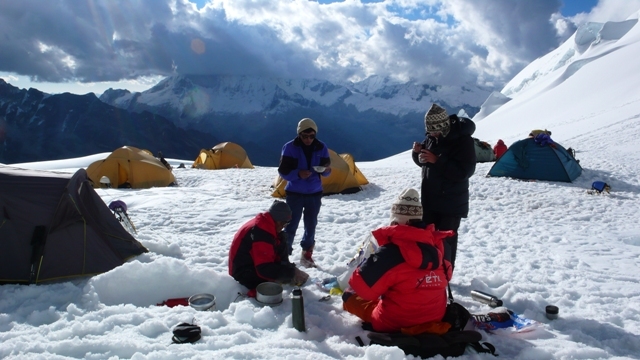 Leaving base camp, we will head up to the left, towards the morrena (5000m). Once entering the glacier, we will find soft snow and pass several hills, until finally reaching a large platform; where we will make camp for the night (Camp 1).