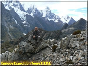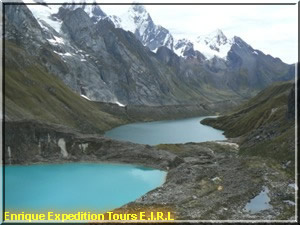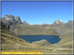 Walking-time about 6-7 hours. Now we pass the third pass which is named Paso de Carnicero (4600). We descend to the lakes of Atocshaico, Carnicero and see the mountains Siula, Jural, Carnicero y Trapecio.