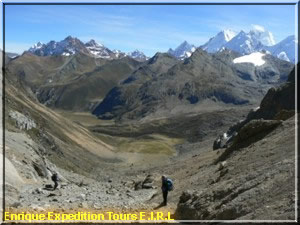 Today we pass the point of Punta Tapush (4900) and observe the mountains Auxilio, Diablo Mudo. Besides we walk up to the pass of Yaucha (4800). Where the groups usually descend to the mountain ravine of Haucrish we can see parts of the glacier of Hirishanca and Yerupaja. We arrive at the lake of Jahuacocha, camping.