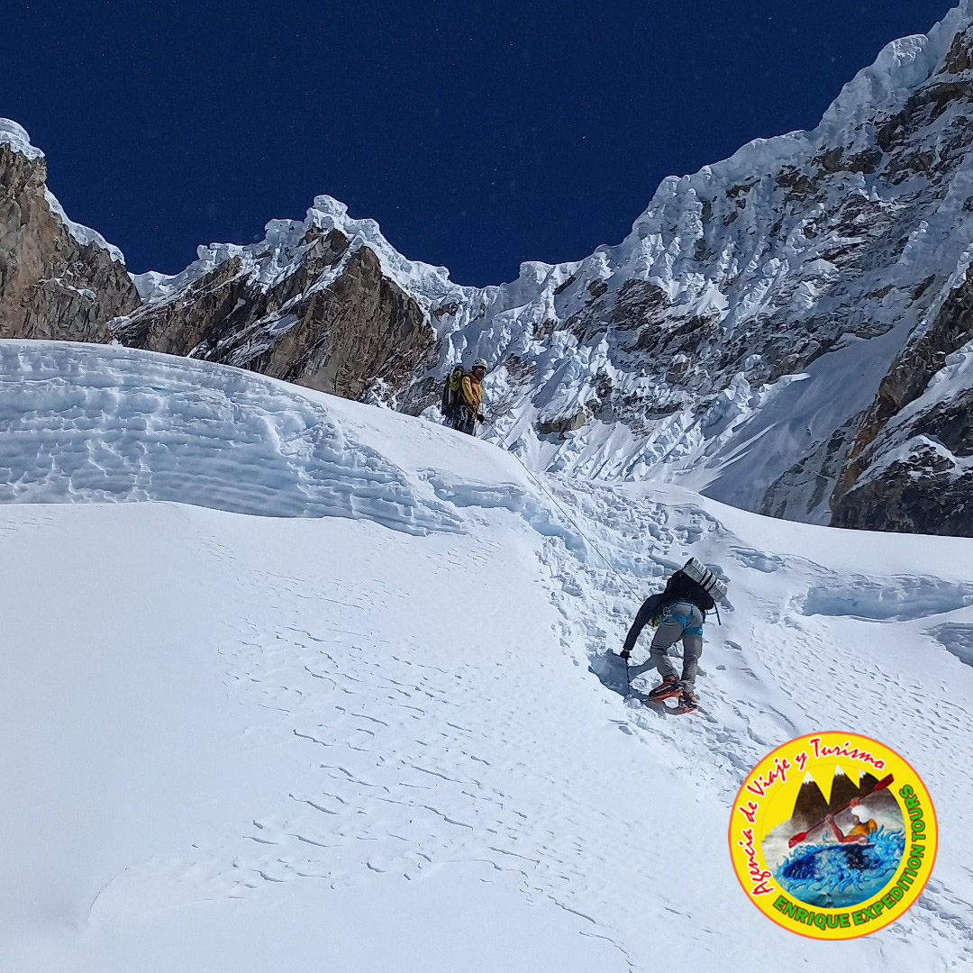 Salimos muy temprano del Cb, subimos una morrena encima de la laguna Lejiacocha y nos dirigimos hacia el C1 (5200) para llegar al C1 hay que pasar una zona pedregosa de unos 400 metros encima de la cual está el C1, en esta parte el equipaje lo llevaremos con porteadores ya que el acceso de mulas es imposible y si hay nieve en esta parte utilizar grampones y piolet en esta zona nos dirigiremos más a la parte izquierda posible y también es conveniente pasar muy temprano ya que caen muchas piedras, por lo tanto le proporcionaremos cascos, la pendiente de hasta 50 -55º. Si es un año seco la nieve empieza a mitad del corredor donde se entra al glacial. Desde este punto al C1 ir Subiendo una interminable cuesta de 40 – 45º porteando nuestras equipaje y también sorteando alguna grietas estaremos llegando al C1 a 5200m estaremos apreciando una vista espectacular del gran plato glacial que tiene este nevado.