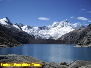 Passing the second pass of our trekking which is called Cedros (4750), we cross the mountain ravine of Cedro and Alpamayo. Now we visit  archaeolocigal ruins (circles, agricultura terraces from the culture of Recuay). We see the mountain tops of  Millhuacocha, Pilanco, Pumapampa, etc. and continue our way until we reach  Jancarurish. From this place we have a phantastic view to the ALPAMAYO (5947), the most beautifulst mountain of the World. Walking time about 6-7 hours.
