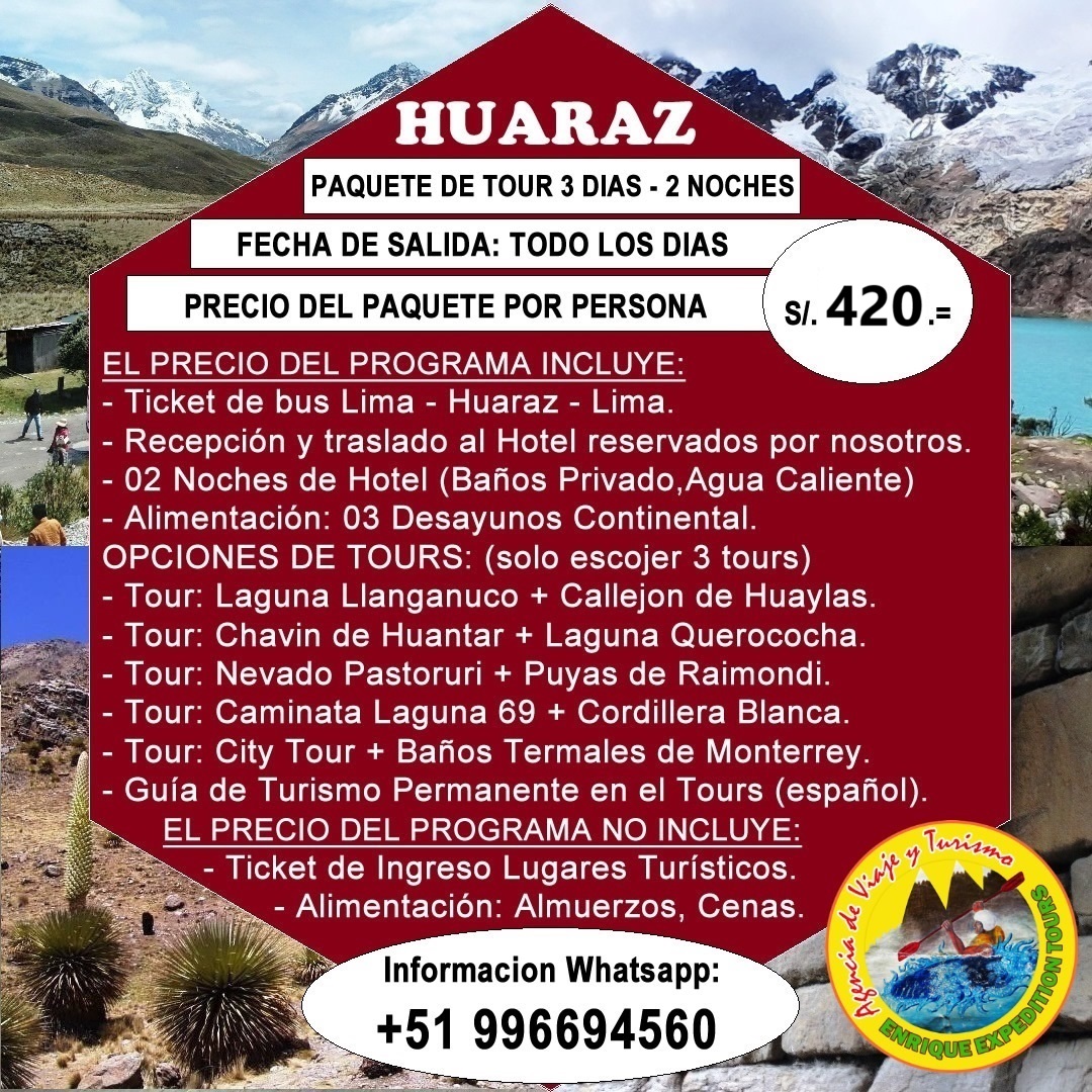 PROGRAMAS ECONÓMICOS DE TOURS EN HUARAZ 3 DÍAS – 2 NOCHES, Operadores especializados en la organización de Programas Económicos de Tours en Huaraz 3 días – 2 Noches, contamos con un equipo de profesionales de experiencia laboral en el campo de Turismo Convencional, cuyo objetivo principal es brindar calidad, seguridad y garantía en todos nuestros servicios, de esa manera, cumplir con las expectativas y exigencias del Cliente. Nosotros le ayudaremos a organizar su programa Tours en bus, Tours Convencional, paquetes turisticos a huaraz precios, paquetes de viaje a huaraz, paquetes a huaraz desde lima, Trekking, Climbing, Caminatas, Escalada en Hielo en la Cordillera Blanca y Huayhuash como también en Cusco – Arequipa – Puno - Perú. |