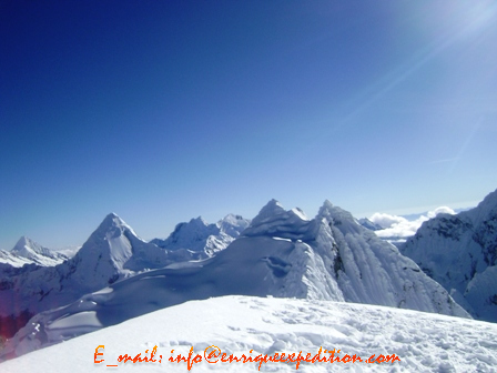 Saldremos de campamento aprox. 3:00am. Y escalaremos corredores (65 – 70º) que nos llevara a la parte alta de la Garganta (6010m) y de este punto estaremos subiendo largas lomas, y evitaremos grandes grietas hasta llegar a alcanzar la cumbre cimera del Huascarán (6768). Jornada de aprox. 12 horas,
