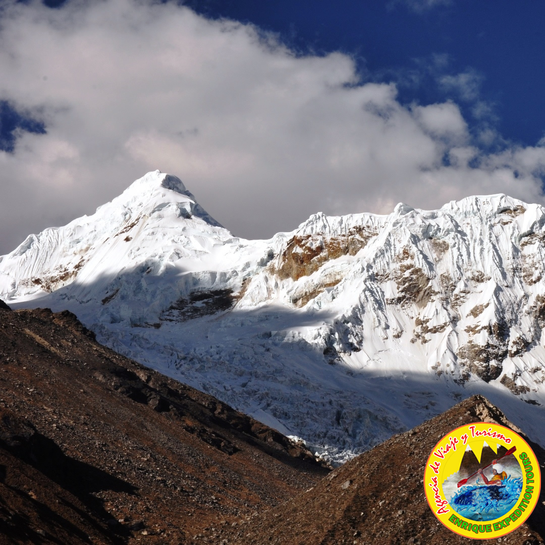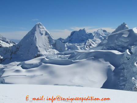 Este día atacamos muy temprano (3 – 4 a.m.) asía la cumbre de Tocllaraju (6.034m.). Atravesamos y ascendemos el glacial N hacia el collado con el aquilpo S. y escalaremos la arista NO que presenta pendientes de 55 a 60º que tiene una rimaya en su parte baja y otro más difícil cerca del hongo Cimero. Atravesaremos la rimaya y escalaremos el hongo directamente a la Cumbre. Y retornamos al campo base de Ishinca (horas aprox.12 horas).